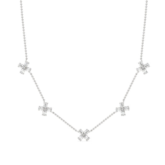 The Mini Fleur Necklace features five delicate pear-cut diamond flowers, gracefully arranged in a semi-circle...